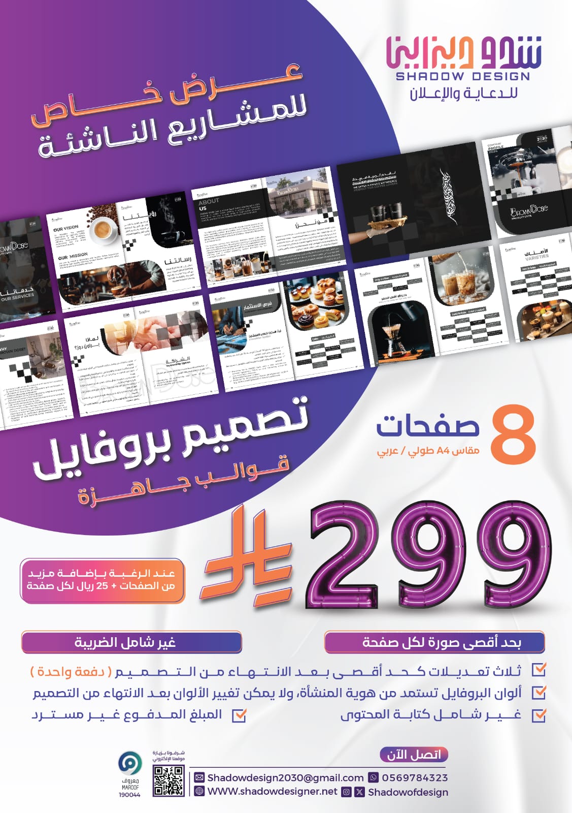 نفخر بنجاحنا بتصميم مئات البروفايلات للشركات والمؤسسات والمشاريع التجارية داخل وخارج المملكة، وتمكنا ببناء شراكة دائمة مع رواد الأعمال لخدمتهم لتحقيق مستهدفاتهم التجارية.